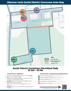 - Be sure to stay within the designated area depicted by Social District boundary signage. Beverages must be purchased in Discover Ionia Social District cups to be taken outside an establishment, and these cups must remain within the district’s boundaries. Signage indicates those boundaries.
